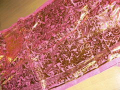 バリ島の家庭の神棚や寺院の神様の廻りを飾るプラダ。神聖な儀式に用いられる布です。ダンスの衣装の布にも使用されています。張りのある生地です。金色のプリントが取れてしまう恐れのあるためお洗濯は出来ないと思われます。地色は、濃いピンク色です。